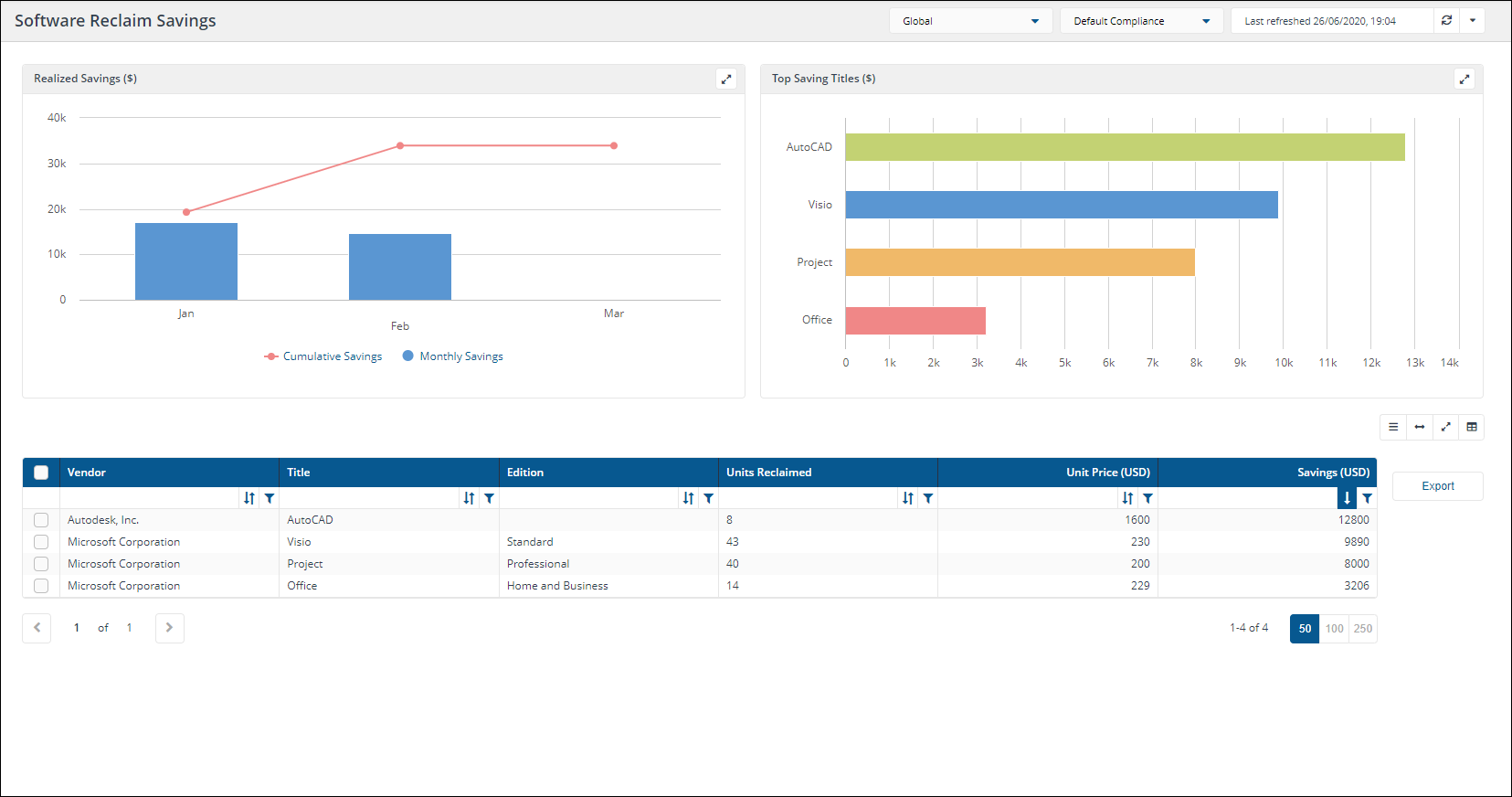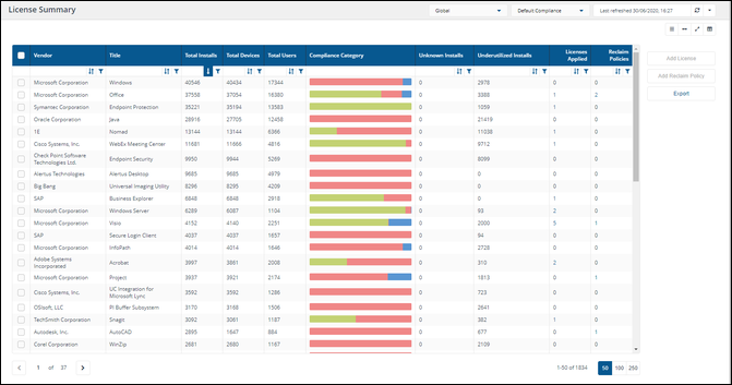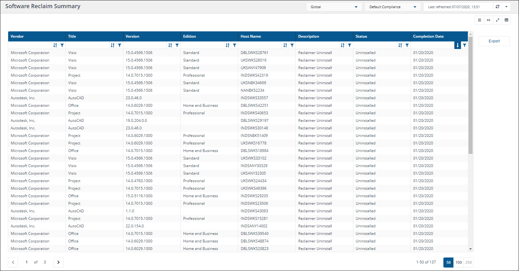 Pages in AppClarity that include an Export all button allow you to export all the data for any tables of information displayed on the page. This may also include columns that are not currently visible in the table display. Click this button to export all of the software reclaim summary details. |