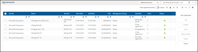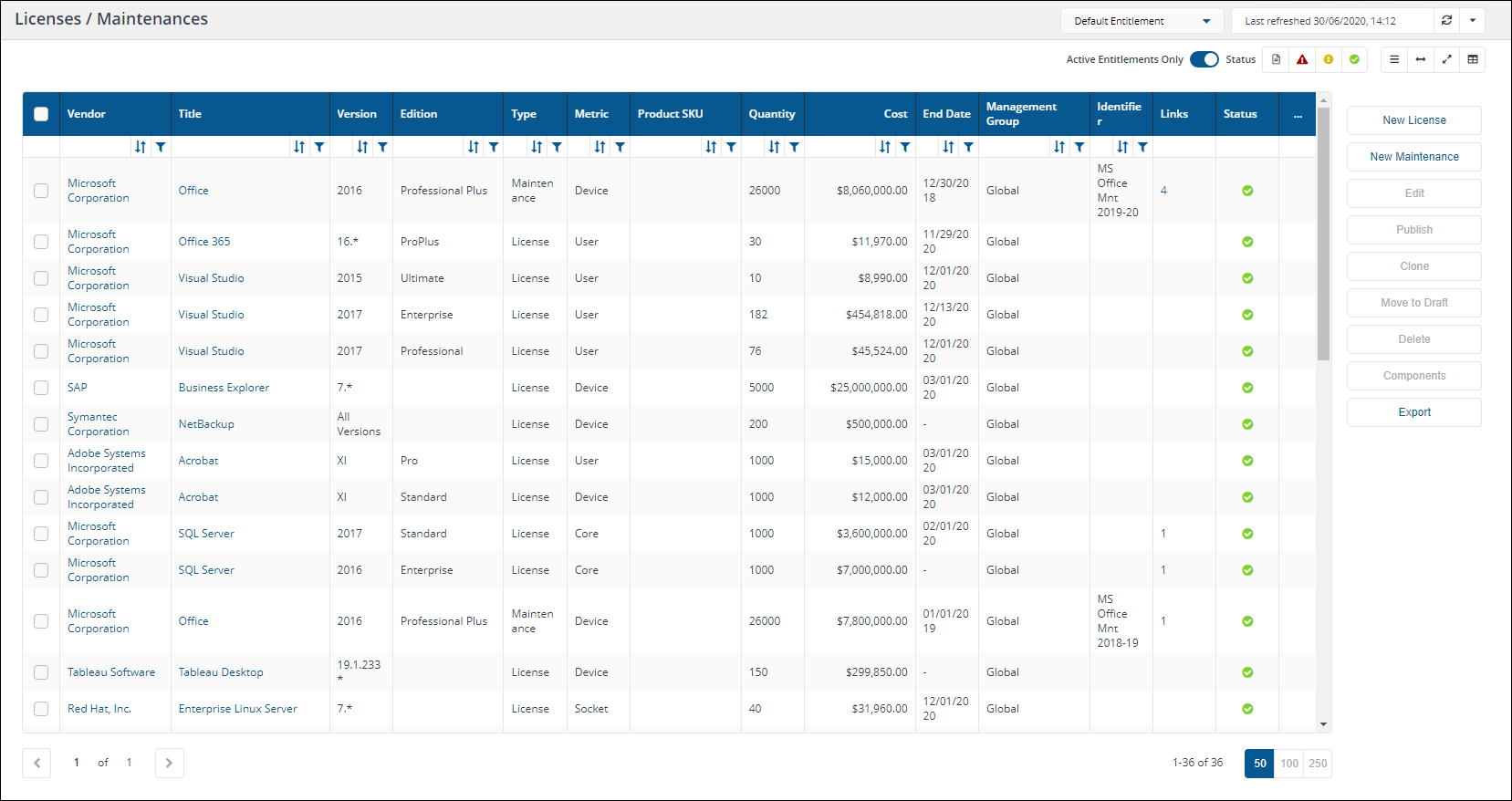 Here you can view, edit, copy, create, publish and delete License and Maintenance entitlements. You can also view any components related to a License or Maintenance and export all the entitlements in the selected repository to a TSV file. You get to this page by clicking the AppClarity > Entitlements > Licenses/Maintenances node in the navigation panel.
