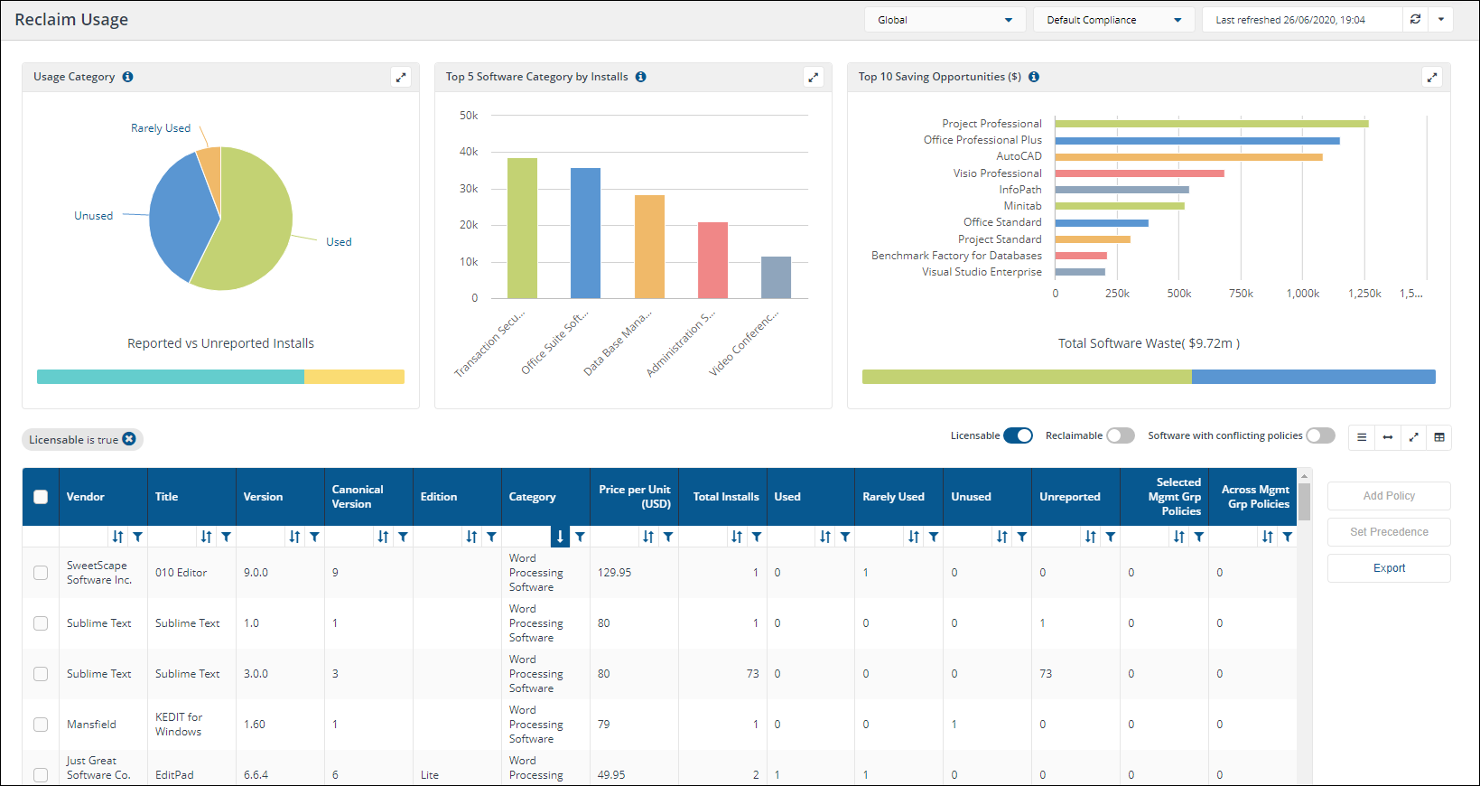 Here you can review an estimate of the cost savings made by applying particular reclaim policies, that is, on successful reclaims. You get to this page by clicking the AppClarity > Reclaim > Savings node in the navigation panel.