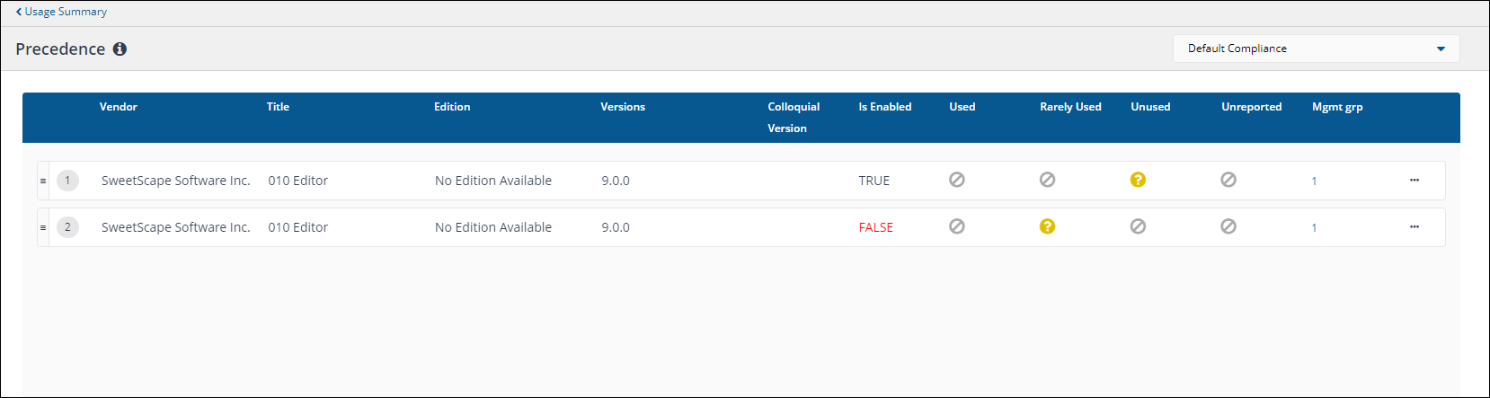 This page lets you set the precedence for multiple policies that cover the same product. Initially this page will display the overlapping reclaim policies in the order they were created, with the most recently created having the lowest precedence. Policies at the top of the page have the highest precedence. Policies are considered in order from the top of the table to the bottom, and you can reorder the rows by clicking and dragging each row up or down. The way that the policies apply to specific products on specific devices are described in the following bullet points: