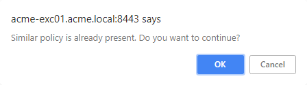 Click this button to publish the policy. When you publish the policy a check will be made to see if it overlaps with any other existing policy. If it does, you will see a popup similar to the following: If you decide to proceed with the publishing you will subsequently need to set the precedence for the policies to decide which one should be preferred. This is done on the Precedence page but can only be done for live policies. This means that you will have to refresh the reclaim consolidation report first, which can be done from the Policies page. |