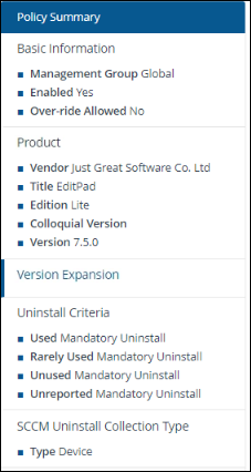 This field will expand all the individual matching versions for the vendor, title, edition and version. The expansion is done according to the wildcards in the Versions string: If that string contains no wildcards the Version Expansion field will contain a single entry for that specific version. If the Versions string contains just an asterisk * then the Version Expansion field will contain all the versions for the selected vendor, title and edition. If the Versions string contains a number followed by *, for example 11.*, then the Version Expansion field will contain all the versions starting with that number and so on. There are four fields for each matching version row displayed in the Version Expansion field, as described in the following table: