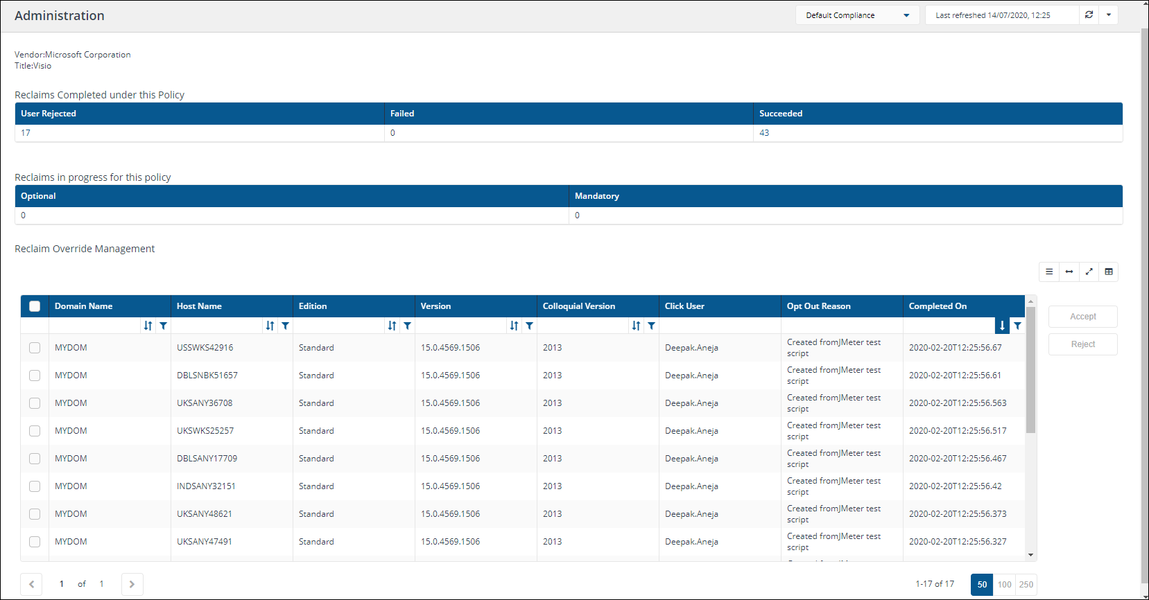 This table shows the reclaims that must be processed by the administrator. This is where the user has opted to keep the software and provided a suitable reason for it and that reason must be approved or rejected by the administrator. The columns of the table are as follows: