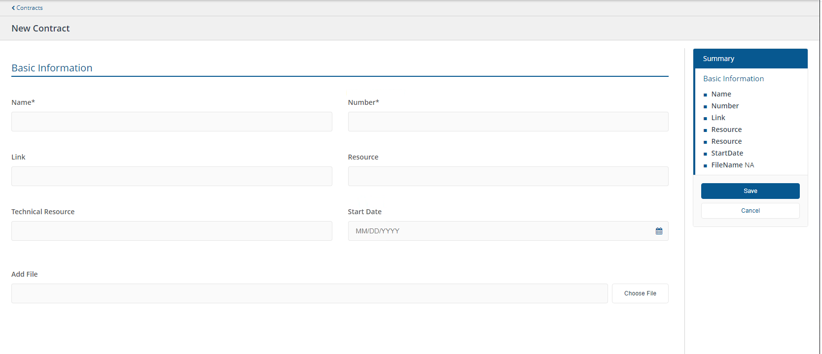 In the New Contract page set the details for the contract. In our example we make the following settings: