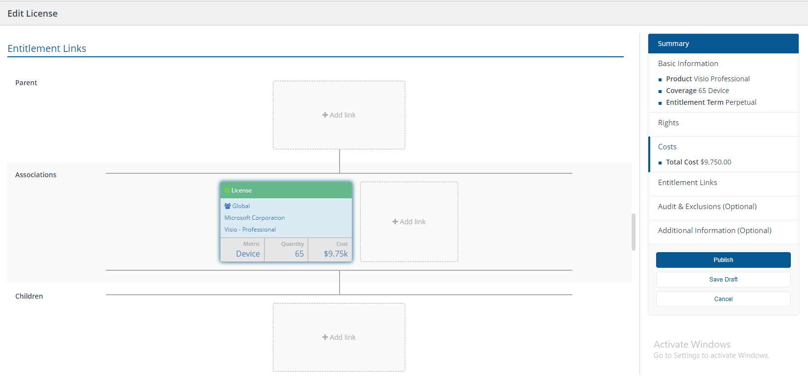 Click on Publish, this returns to the Licenses/Maintenances screen, and a 1 will now appear in the Links column for this entitlement.