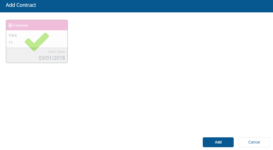 On the Add Contract pop-up subsequently displayed, locate the contract created earlier. In our example this was called Visio, and click the contract, a green tick will appear and click Add.