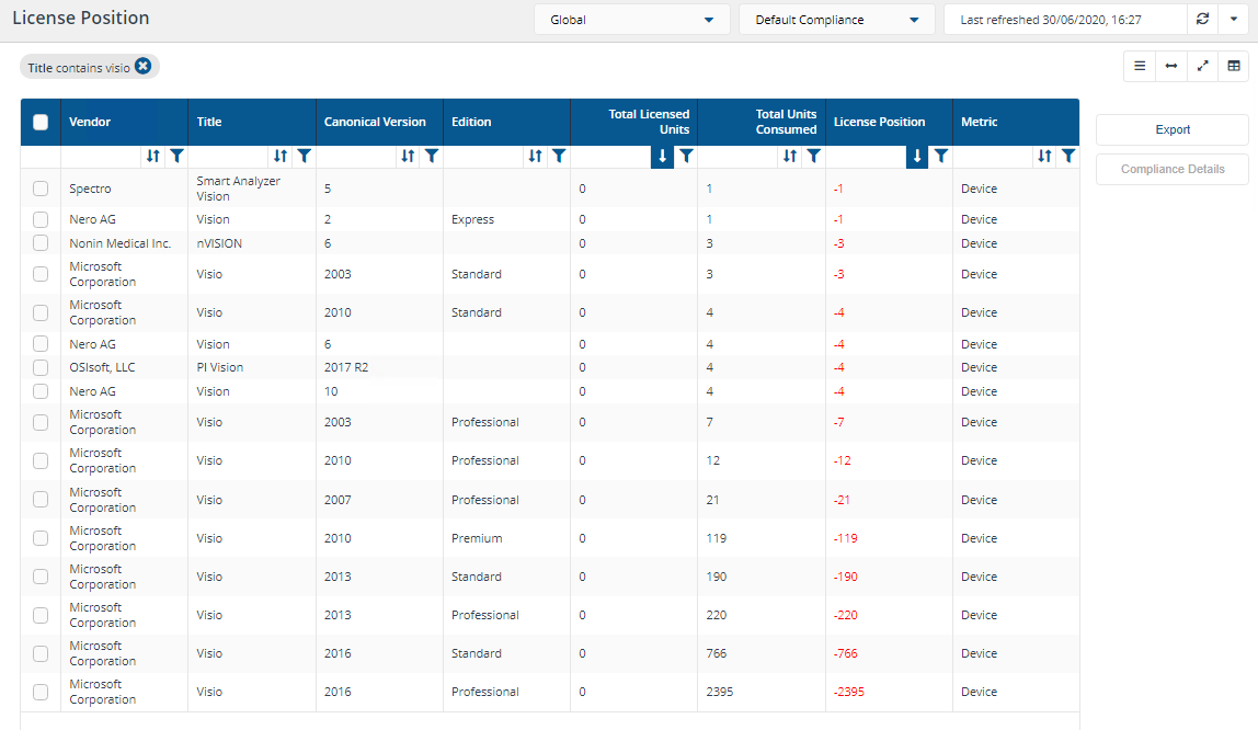 In our example you can see that Visio with Edition of Professionalnow has a License Position of 5 This indicates that the installations of the software title are now licensed and there are 5 spare licenses for Visio.