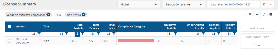 This example shows how a license deficit for a Microsoft Visio installation can be turned into a surfeit by creating a license entitlement. It assumes that you already have inventory data and that you've run the Compliance report.