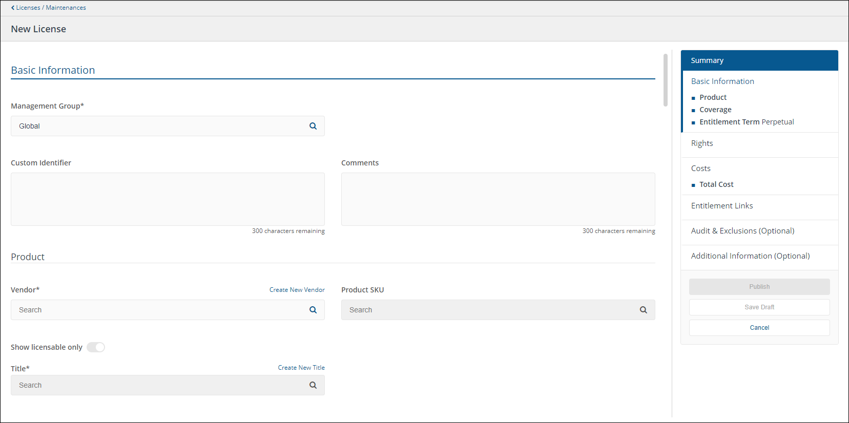 Now everything is set how we want it lets make this license entitlement take effect. To do this we click the Publish button at the bottom of the page. We could have clicked Save draft, if we were in the middle of making changes and didn't want to make the license active and the license would have been saved as draft in the Licenses/Maintenances page.