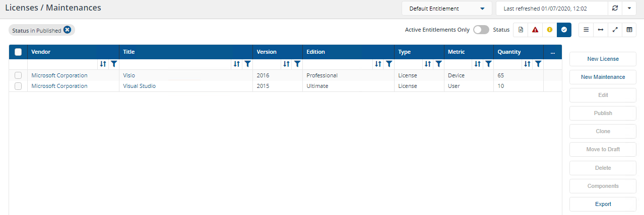 Having published the license entitlement an entry now appears in the Licenses/Maintenances page.