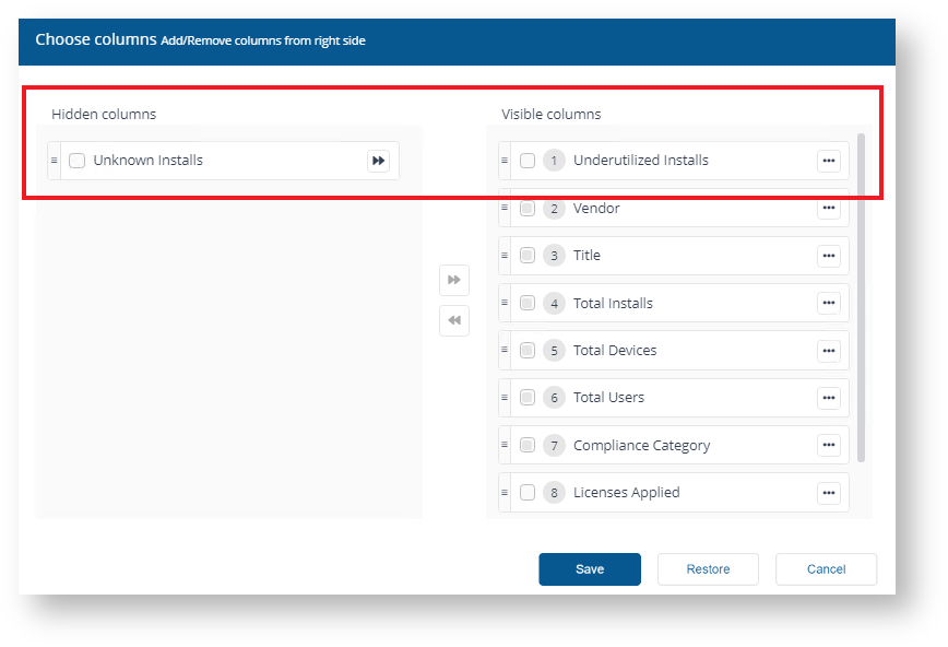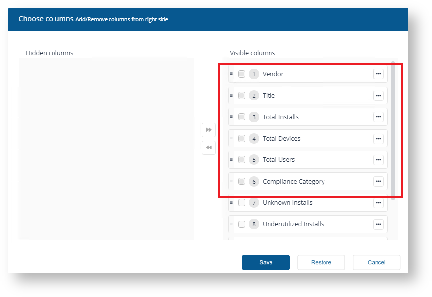 For example, in Viewing Compliance License detailswe viewed the License Summary, using the Choose columns control you can pick which columns are displayed in the table. On this page, the default columns are: