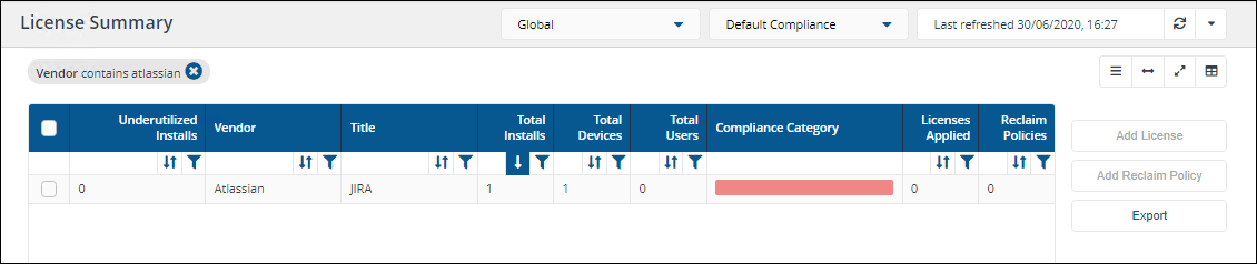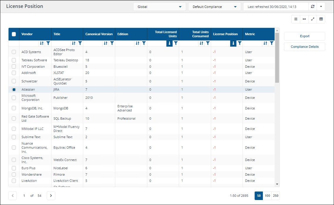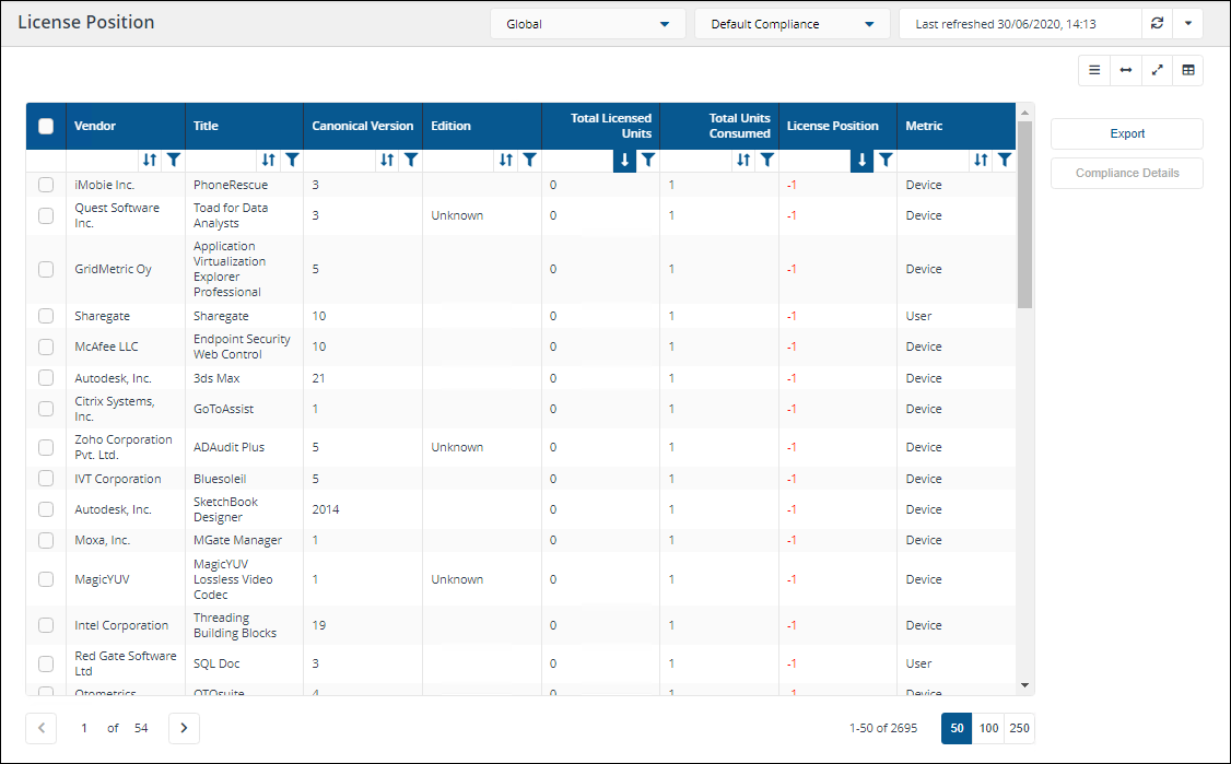 When the Generate Report action has completed, switch app to AppClarity > Compliance > License Position.