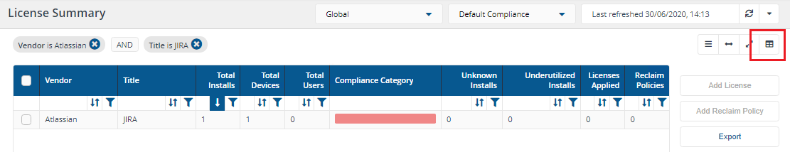 When you have refreshed the LDC reports, refresh the Compliance Report and view License Position for Compliance using the Refresh reports icon on the top right of the page.