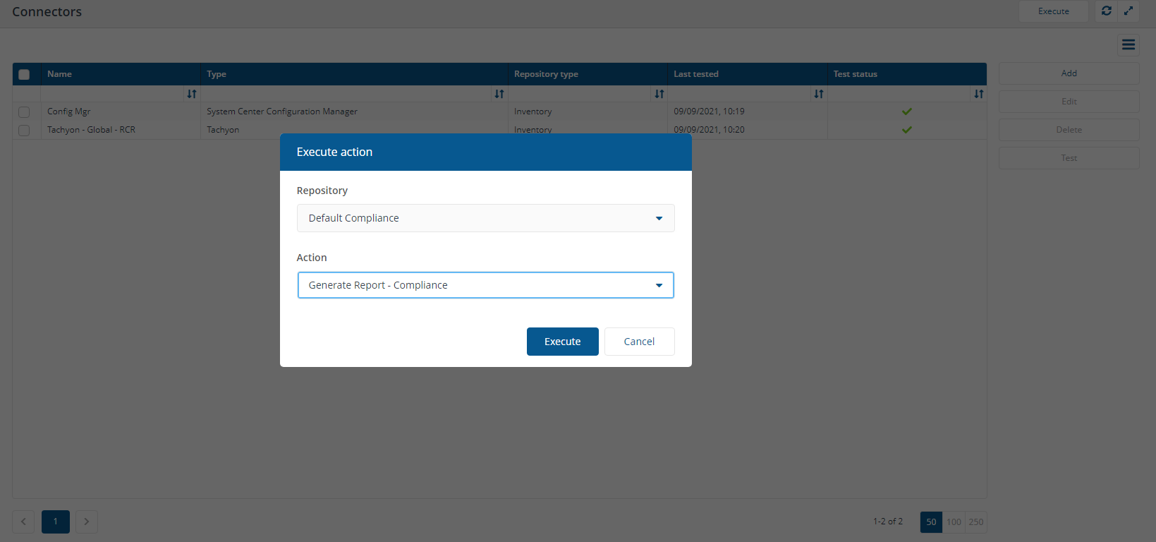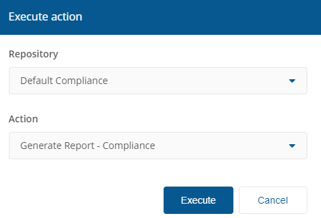 In the Execute action pop-up from Repository select Default Compliance and Action as Generate Report - Compliance, and click Execute.