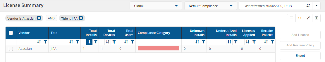 In the License Summary by Installs, you can review the license position for that software and filter a detailed table, for example by Status, Machine Name or by Primary User.
