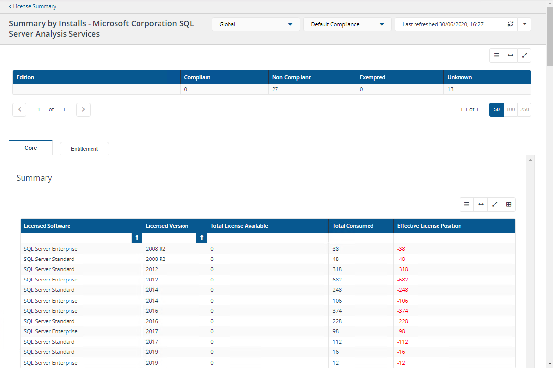 In the example shown, the License Summary page has been filtered to show results with the title, SQL Server Analysis Services (SSAS), then clicking on Compliance Category color bar for SSASshows the ELP for this product. SSAS is now matched with mapped with SQL Server, this means the complete ELP position is shown for SQL Server.