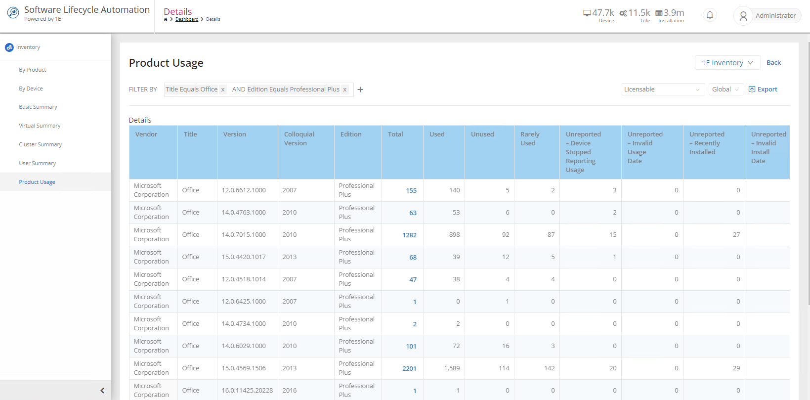 Doing this displays the Product Usage table for that product. Here you can see the vendor, title, version, colloquial version and edition for the product alongside a total that shows the number of installations for the product. There are also four columns for each of the usage categories. In our example Office Professional Plus version 12.0.6612.1000 has 155 installations, 5 of which are unused and 2 are rarely used.