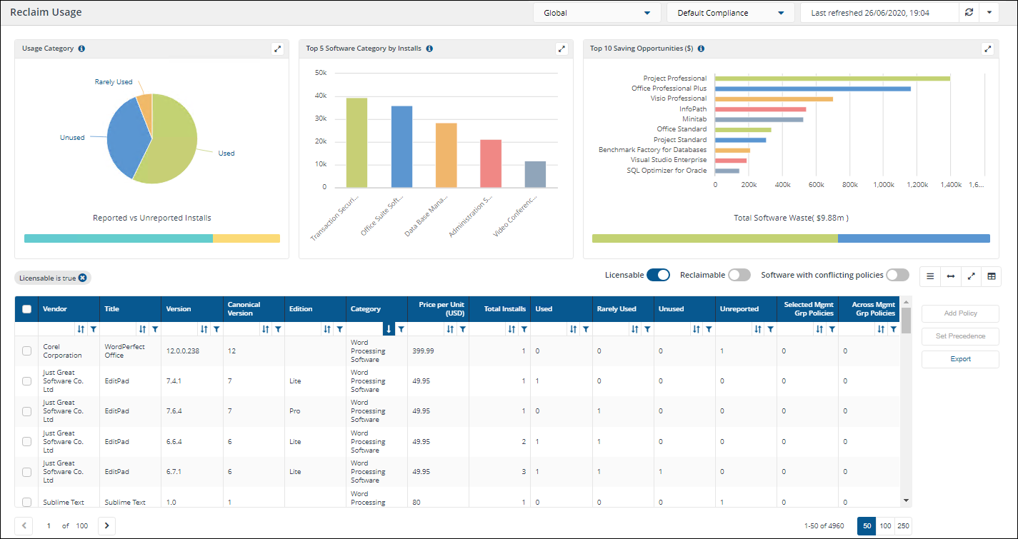 This page also displays Usage Category and Reported Vs UnReported Installs, Top 5 Software Category by Installs and Top 10 Saving Opportunities ($) and Total Software Waste charts and a table showing vendor, title, version, colloquial version and edition for the product alongside a total that shows the number of installations for the product. There are also four columns for each of the usage categories Used, Rarely Used, Unused and Unreported.
