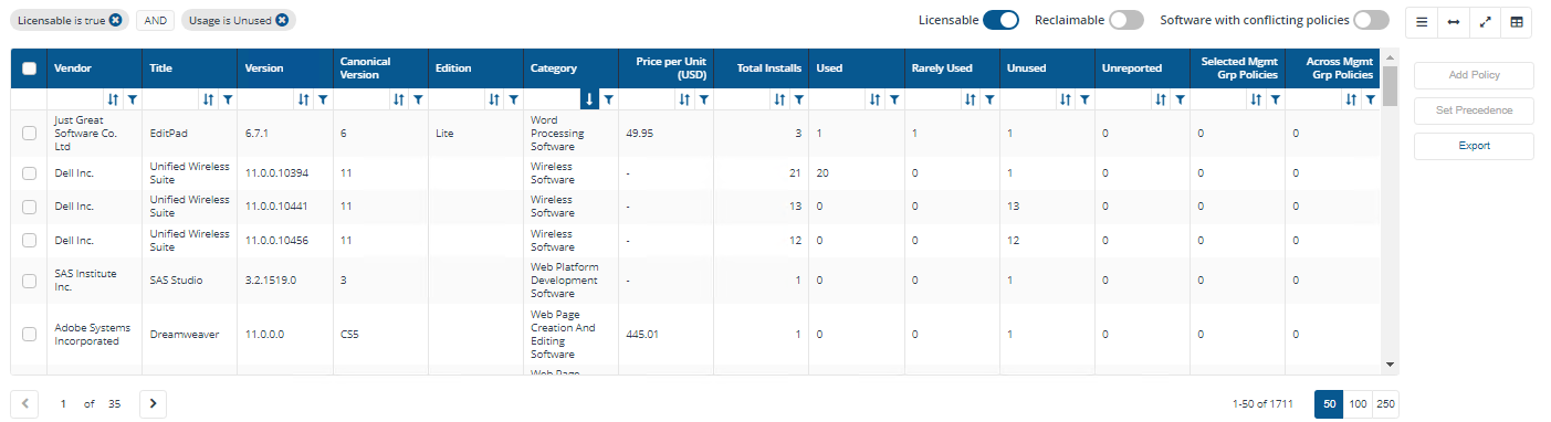 To filter the table by Usage Category, Top 5 Software Category by Installs or byTop 10 Saving Opportunities click on the color bar for the category you're interested in, for example in our case there's 1,711 records in Unused software in Usage Category.