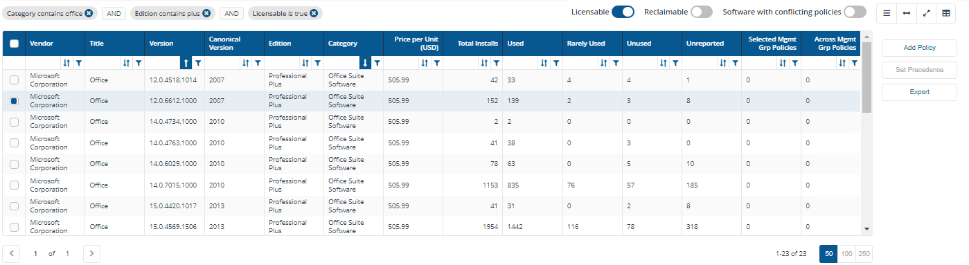 In our example let's investigate Office Professional Plus for example you could do this by filtering the table view by Category containing Office and by Edition containing Plus or if you know the version, by filtering on Version.