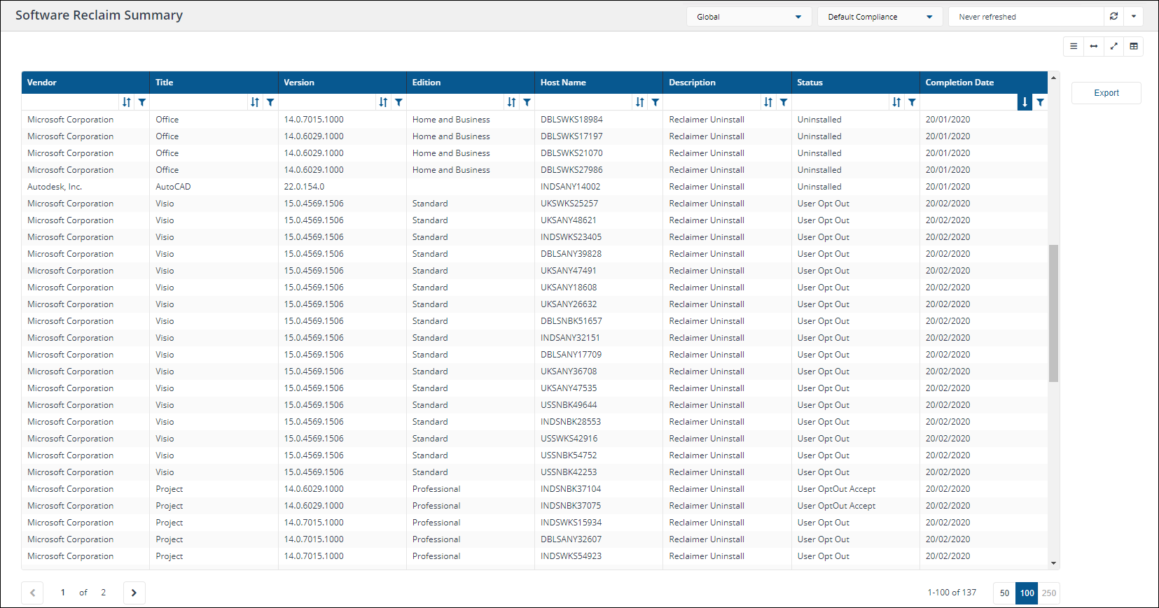 When AppClarity is installed it creates a schedule to run Reclaim reporting each night at 00:00. This report updates the contents of the AppClarity > Reclaim > Reclaim History and Savings pages. Both of these reports can be filtered by Management Group (if you have set these up) from the dropdown list at the top of the page. You can run the report manually also, if you need more up to date information, as will be seen in the following steps.