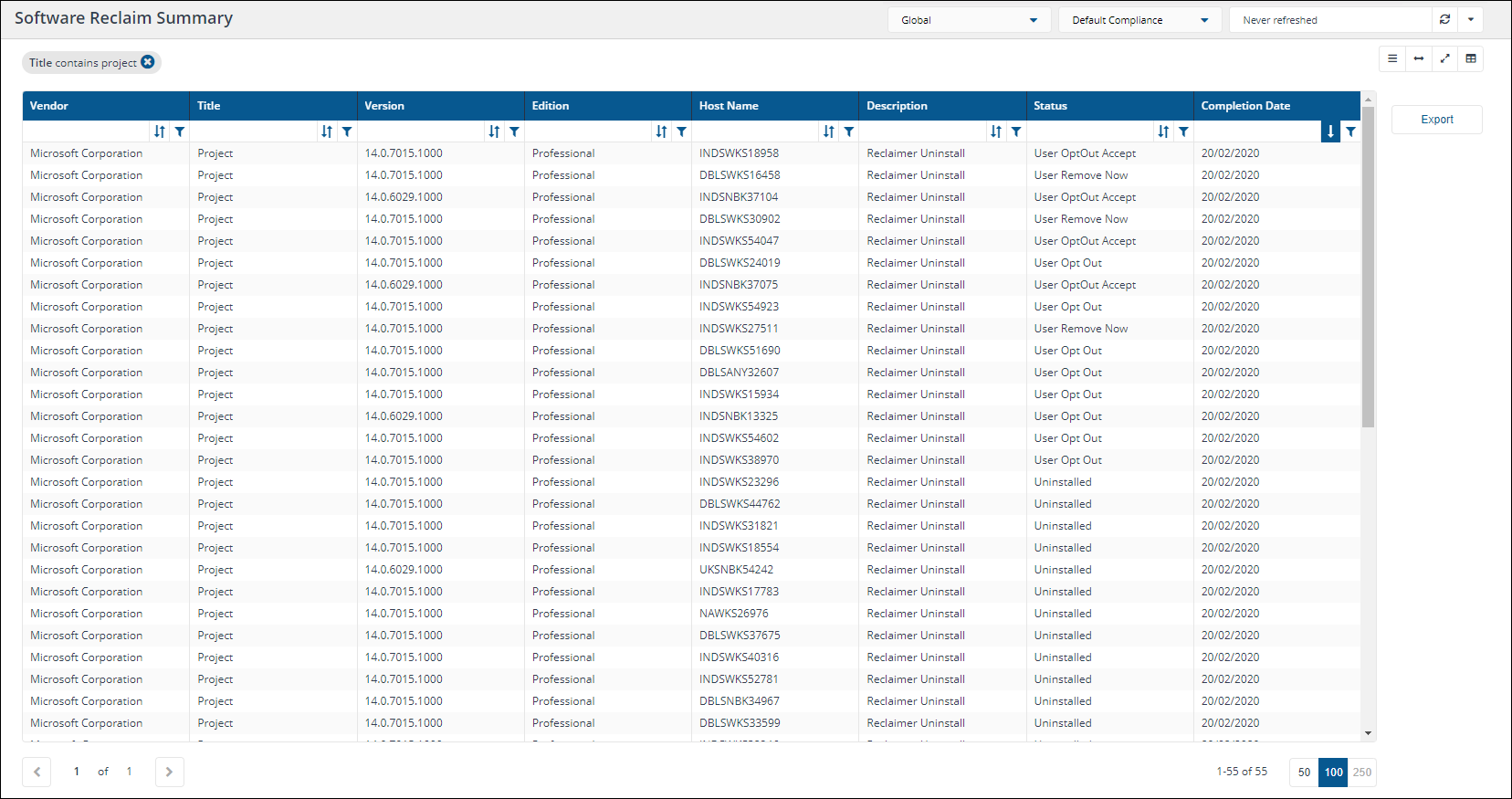 To filter on specific software, for example Microsoft Project, set a filter to get directly to the Microsoft Project installations.