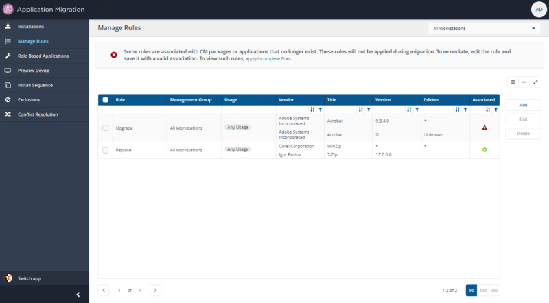 Application Migration users will see alerts on specific pages that identify orphaned applications - when one or more rules or applications in an application set reference Configuration Manager objects that no longer exist, or where the Configuration Manager association has been deleted.