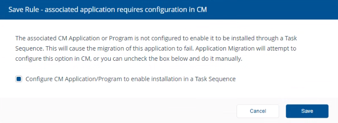 When you save the migration rule, and the Auto Install flag is not already enabled for the associated Application or Program, then you will see the popup shown opposite. You should enable Configure CM Application/Program to enable installation in a Task Sequence and click Save. The Auto Install status will then change from red to green. Status values are described in the table below.