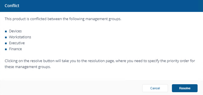 It is possible for a device to exist in multiple Management Groups, so it is also possible for conflicts to arise, where a device is in multiple Management Groups, each with different rules defined. If this occurs, the rule will be shown as a Conflict on the Installations page that must e resolved in order for any rule to apply during OS deployment. Refer to Viewing and resolving migration rule conflicts.