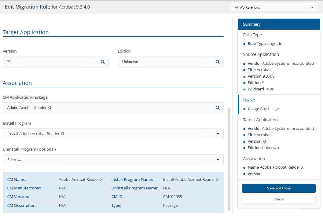 Defines the Configuration Manager Application or Package and Program that will install the Target Application. The association of a Configuration Manager Application or Package and Program with a Vendor, Title, Version and Edition can be made ahead of creating migration rules through Manage associations in Inventory, or while defining the rule. |