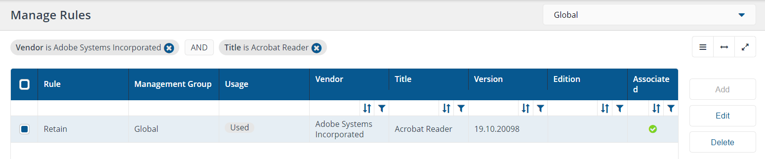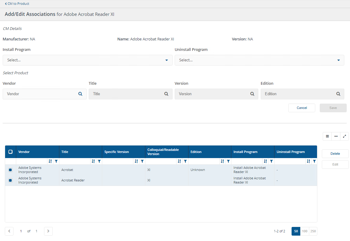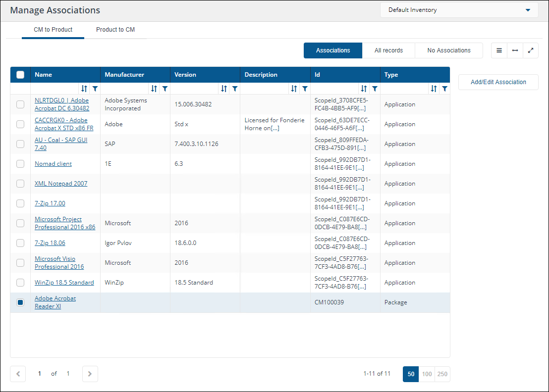 In our example, we can view the Adobe Acrobat Reader XI associations by switching to the Inventory app and then on the Manage Associations page, viewing CM to Product, selecting Adobe Acrobat Reader XI and clicking Add/Edit Association.