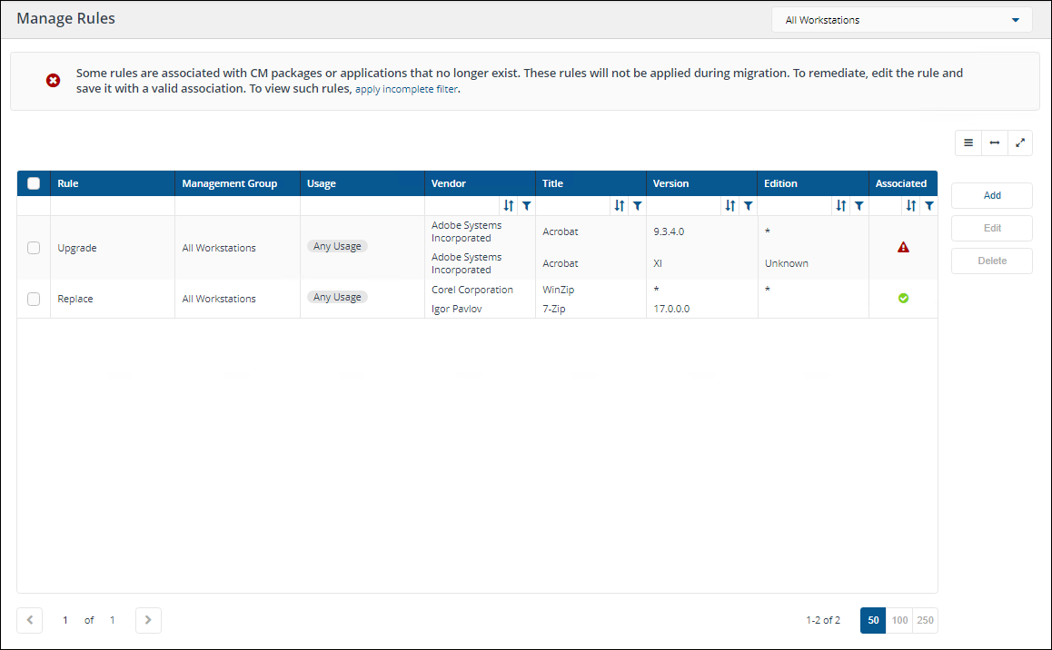 You will be notified when some rules are associated with Configuration Manager packages or applications that no longer exist on the following pages: