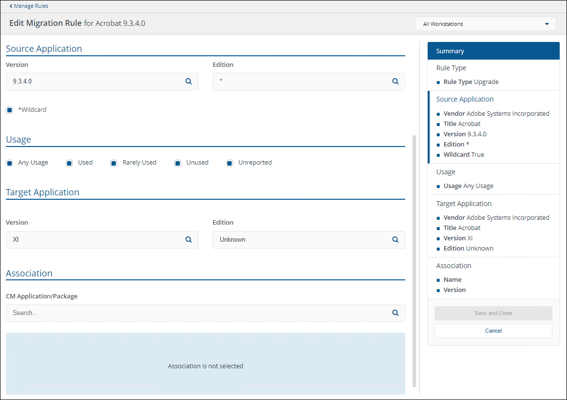 Defines whether the source application will be migrated if it is used, rarely used, unused or any combination of these states. You can create multiple rules for the same Source Application with different usage settings. For example, you may want to retain an application if it is being used, but replace it with a cheaper alternative if it is not being used. |