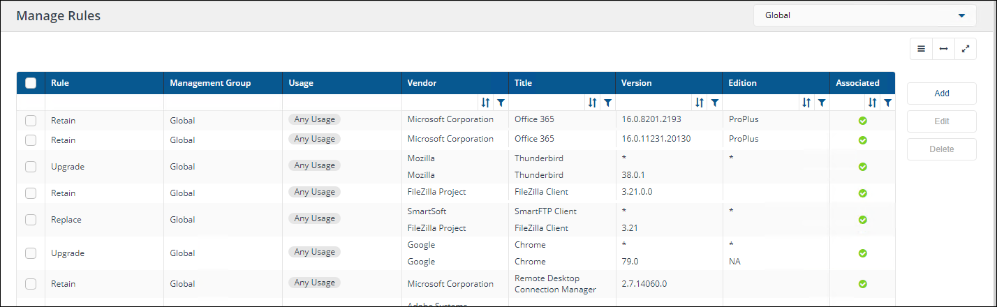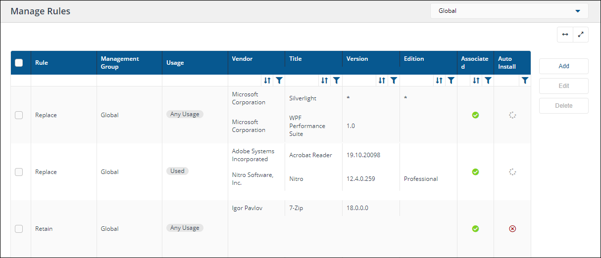 By default, migration rules are Global - they apply to all devices in your organization. In some cases you may want to define different migration rules for an application on different devices. For example, you may want to upgrade AutoCAD 2018 to AutoCAD 2019 everywhere except in the Seattle office, where they need to retain AutoCAD 2018 as they are working with a client on the older version. If you have Management Groups defined in the platform, you can create rules that apply globally or to a specific Management Group. Management Group migration rules take precedence over Global migration rules, so in our example, you would create a Global rule to upgrade AutoCAD to 2019 and a Management Group rule for the Seattle Management Group to retain the 2018 version. Devices in the Seattle Management Group will apply the Management Group rule, not the Global rule,