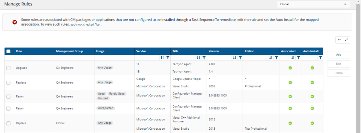 If a rule has Auto Install unchecked, you will be prompted to edit that rule and set Auto Install to enabled. You can view this type of rule by filtering the Auto Install column by Not Checked.