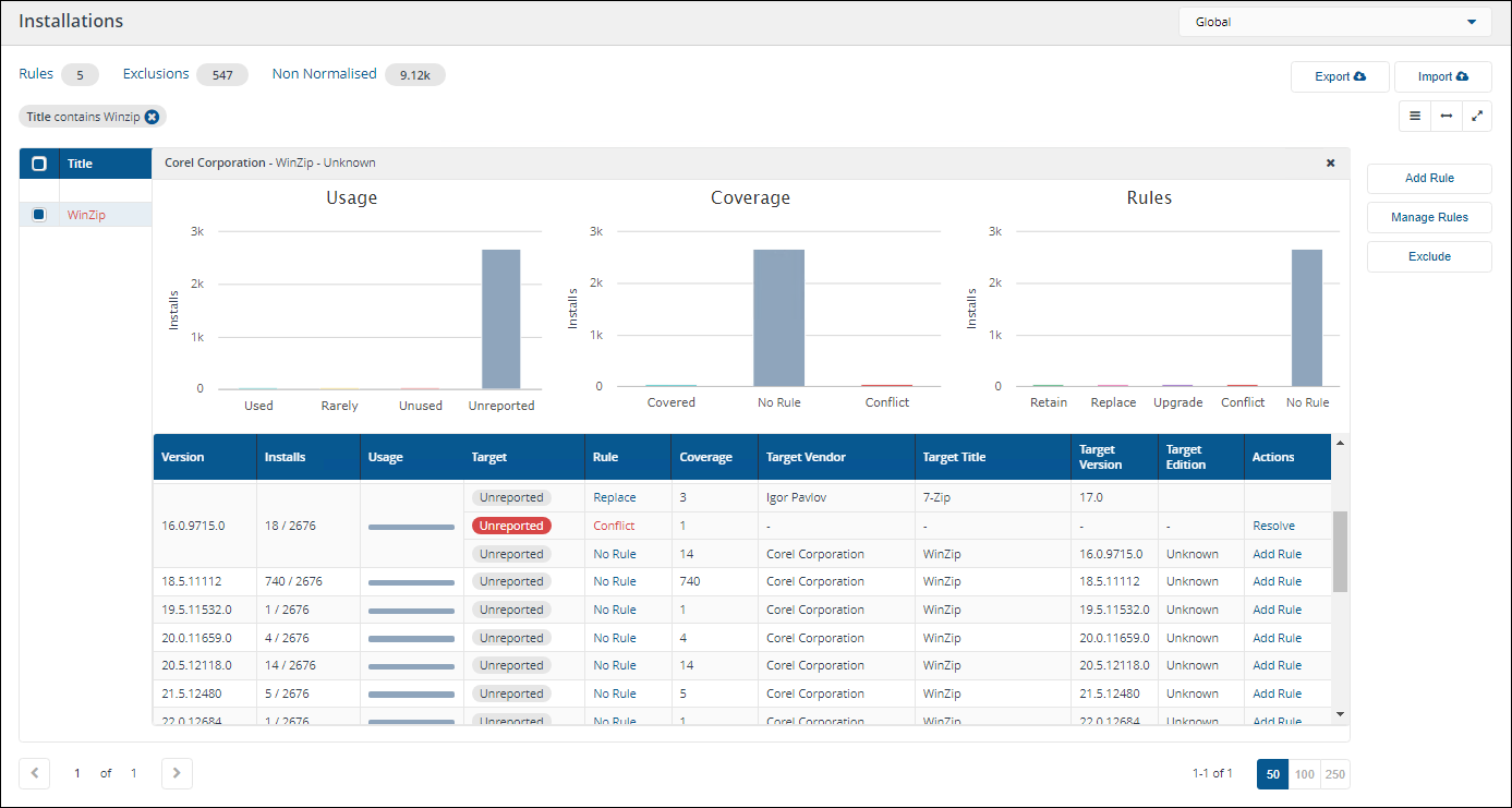 Typically, you will work from the Installations page to identify an installed application that you want to migrate, selecting it and clicking the Add Rule button. This will take you to the Add Rule page, but will pre-populate the Source Application Vendor, Title and Edition according to the application you selected in the Installations page. If you want to create a rule for a specific version of an application, from the Installations page click on the application title to view the installed versions and click the Add rule link in the Action column for the version you want to migrate. Again, this will take you to the Add Rule page, but with the Source Application Version pre-populated along with the Vendor, Title and Edition.