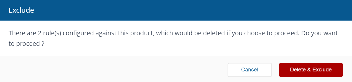 In this case the popup button text will be changed to be Delete & Exclude and the color will change to red indicating that there are consequences for the action. The associated rules are deleted if you proceed.