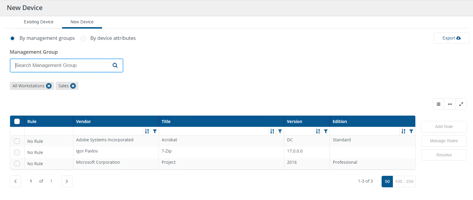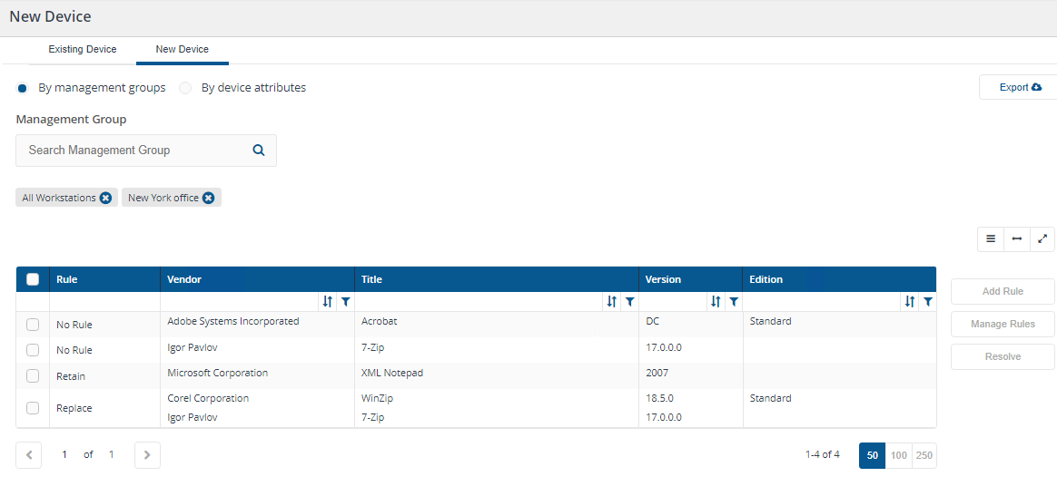 On Preview Device, the administrator selects New Device then selects By device attributes. The admin knows the new computer will be added to the Workstations OU, so enters Workstations in the OU field to find the corresponding Management group which is All Workstations.