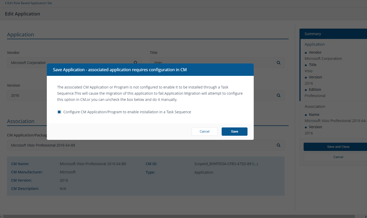 For example, if your application set includes Visio 2013 but there is a rule applicable to the computer being deployed that upgrades Visio 2013 to Visio 2016, Application Migration will return Visio 2016 in the list of applications to be installed.