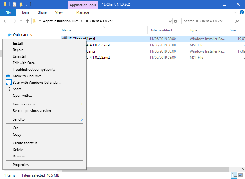Right-click the 1E.Client-x64.msi choosing Edit with Orca from the context menu.