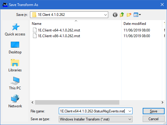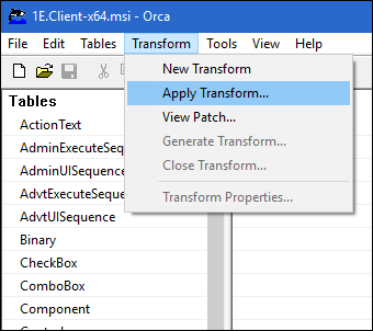 The guidance here is for adding an installer property by editing the base MST transform file provided out-of-box for 1E Client, but the process also works for other MST. Editing a base MST before running the CDA wizard helps you if know you will use the modified MST more than once, for example if you are working in a lab, and want to re-use it in a production environment. This approach only works if you are adding or editing installer properties that are not affected by running the CDA wizard.