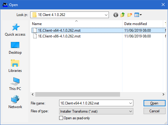 In the Open dialog, select the 1E.Client-x64-5.1.x.mst file.