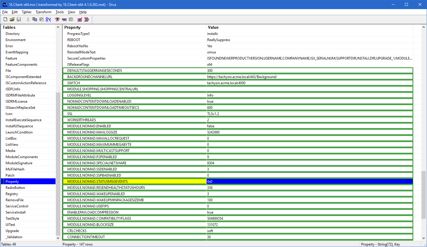 To extend installer properties or change default settings for Nomad clients, you can edit their associated MST transform files by using a tool such as Orca a database table editor for creating and editing Windows Installer packages. Orca is a Microsoft tool for creating and editing Windows Installer packages (MSI) and merge modules (MST transforms). Orca is available from Windows Installer Development Tools.