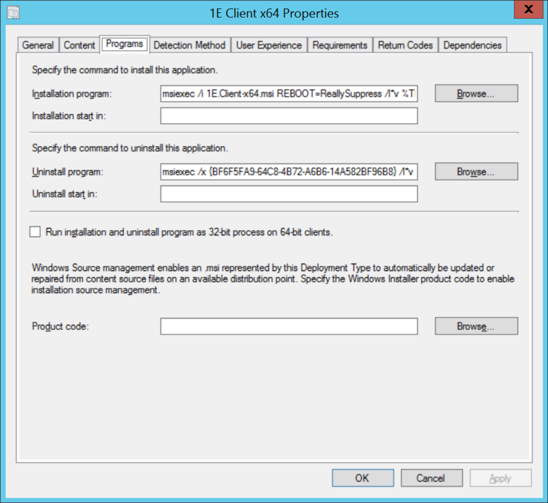 msiexec /i 1E.Client-x64.msi REBOOT=ReallySuppress /l*v %TEMP%\1E.Client-x64-Install-5.1.0.922.log /qn TRANSFORMS="1E.Client-x64-5.1.0.922.mst"