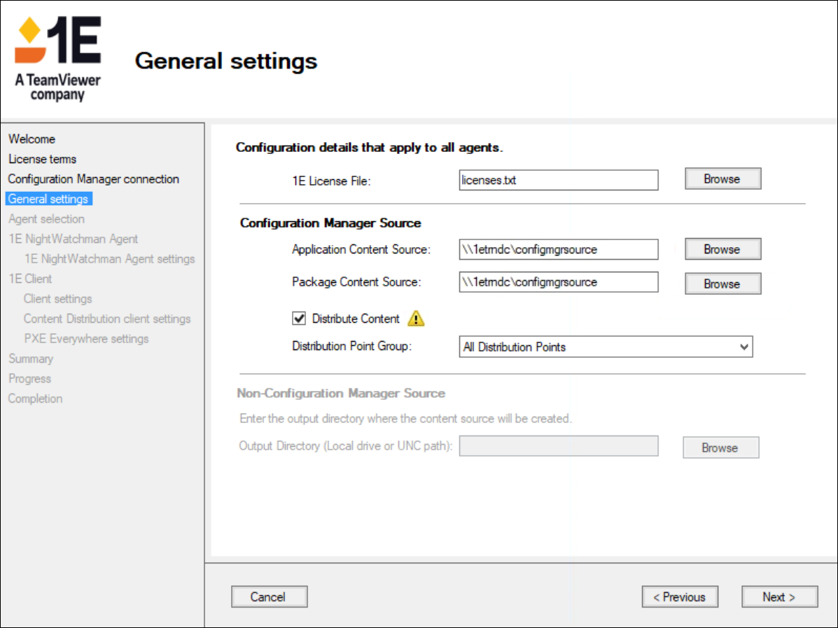 Enter the UNC of the Configuration Manager Package Content Source share where the wizard saves content source for use by Configuration Manager packages. The wizard will create 1E folders below it. For example, your packages UNC may be: \\acme-server\dsl$\Packages. |