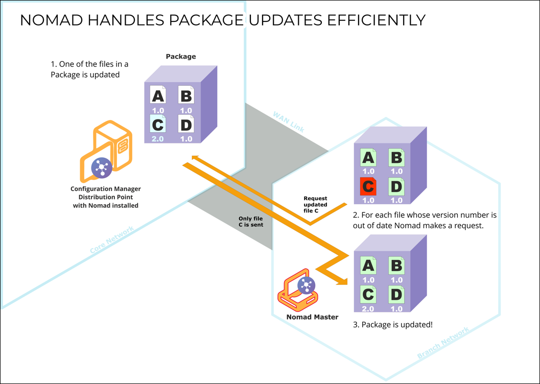 In this example, if a package that has been previously downloaded has one of its files updated, Content Distribution compares each of the file versions for its cached package with the file versions for the incoming updated package. If a file has an older version, it is requested for download. if that is the only file that has been updated the transfer is complete and the package is updated.