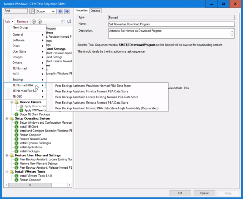 Peer Backup Assistant: Close Nomad PBA Data Store (deprecated) and (usually) OS refresh or OS install on bare-metal actions must be run first. If saving user data was run as a separate task, insert an action in the current task sequence that sets the PBAComputerName TS variable to the same value that is set in the saving task sequence. This identifies the Nomad cache in the network where the user data is saved.