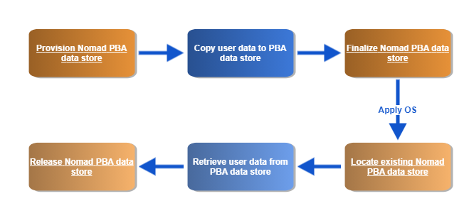 Peer Backup Assistant: Close Nomad PBA Data Store (deprecated) and (usually) OS refresh or OS install on bare-metal actions must be run first. If saving user data was run as a separate task, insert an action in the current task sequence that sets the PBAComputerName TS variable to the same value that is set in the saving task sequence. This identifies the Nomad cache in the network where the user data is saved.