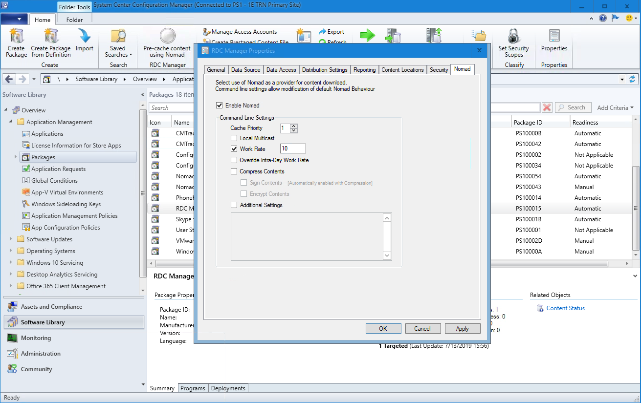 In this example, we will configure a legacy package to use 1E Content Distribution and then deploy it to our example Workstations Collection. Before deploying our package, we are going to amend the Work Rate for our deployment. The Work Rate determines the percentage of available bandwidth to use for the download.