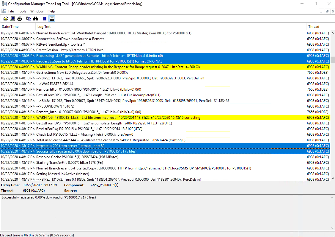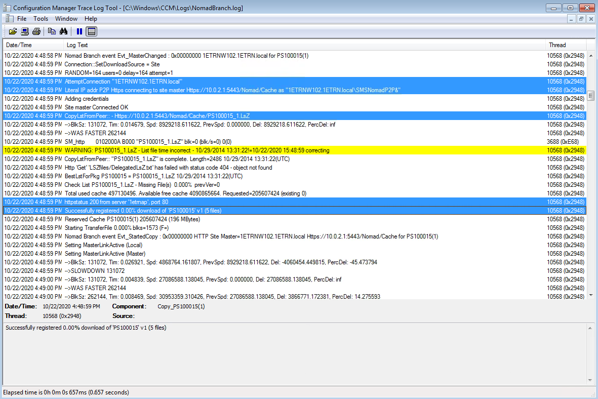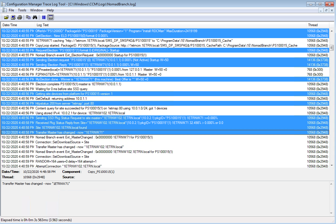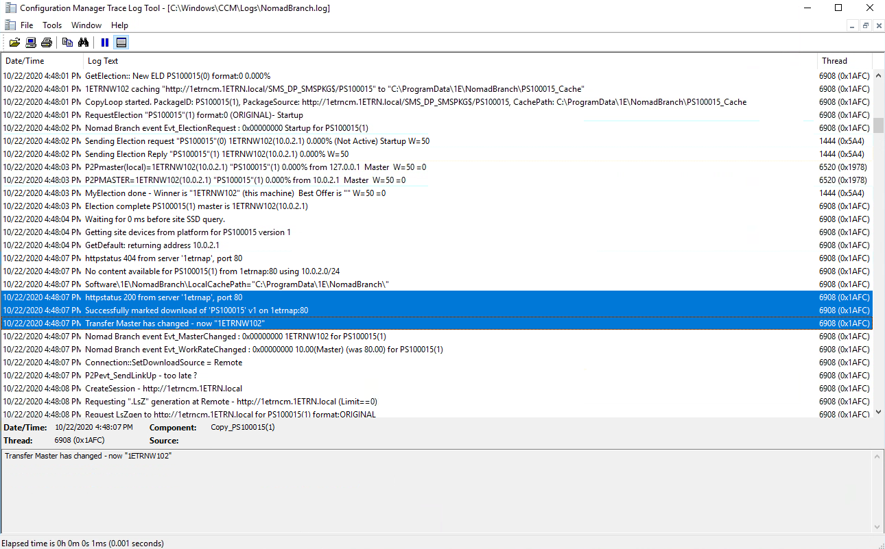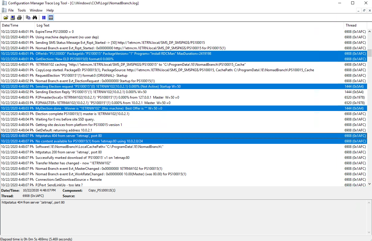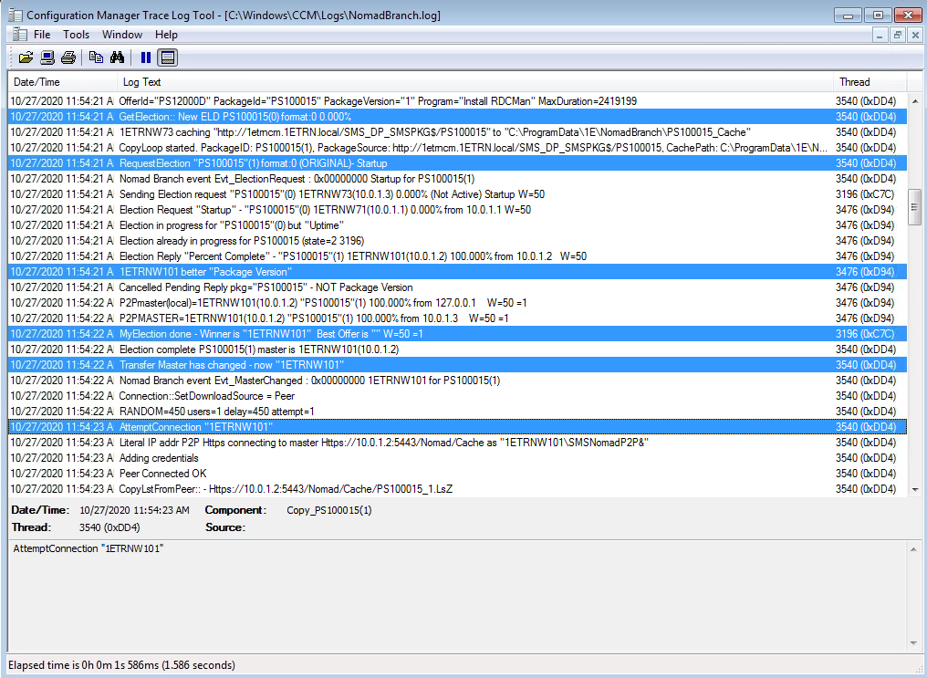 Our elected master is 1ETRNW102 in subnet 10.0.1.0 in the C:\Windows\CCM\Logs\NomadBranch.log we can see the normal election process. This is followed by a request for content for the RDCMan package but there is no content available.